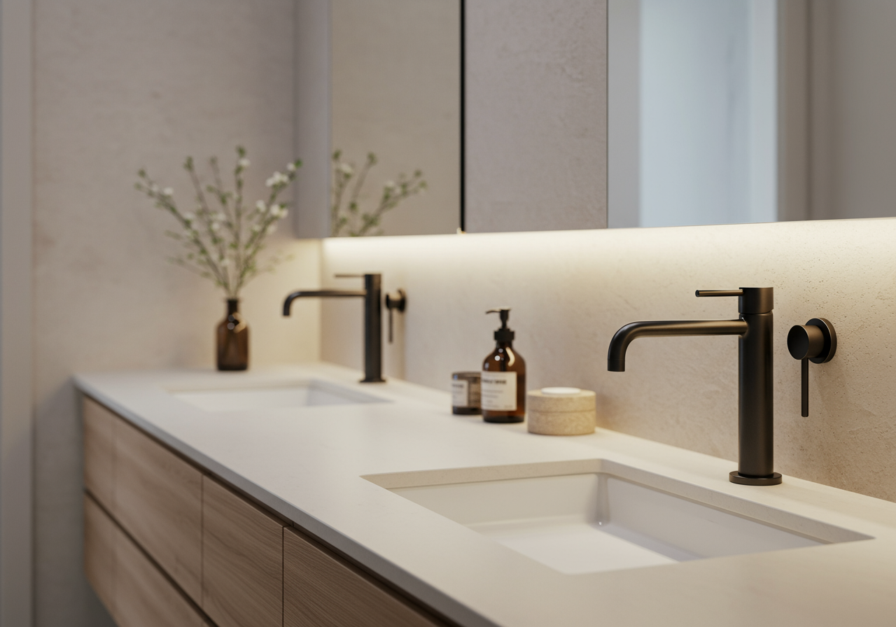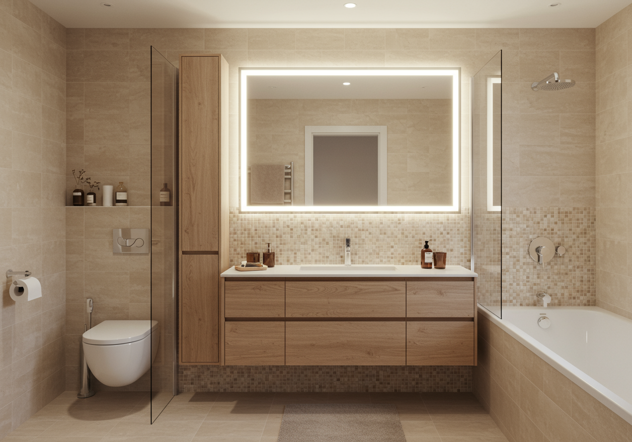 If you’re undertaking a renovation, consider upgrading fixtures and materials. Handmade tile and custom cabinetry can add a touch of style and luxury. Trade stark whites for warm neutrals to create a more relaxed feel—think light wood tones, creams, and beiges. Complete the look with soft ambient lighting from a backlit mirror or pair of decorative sconces.